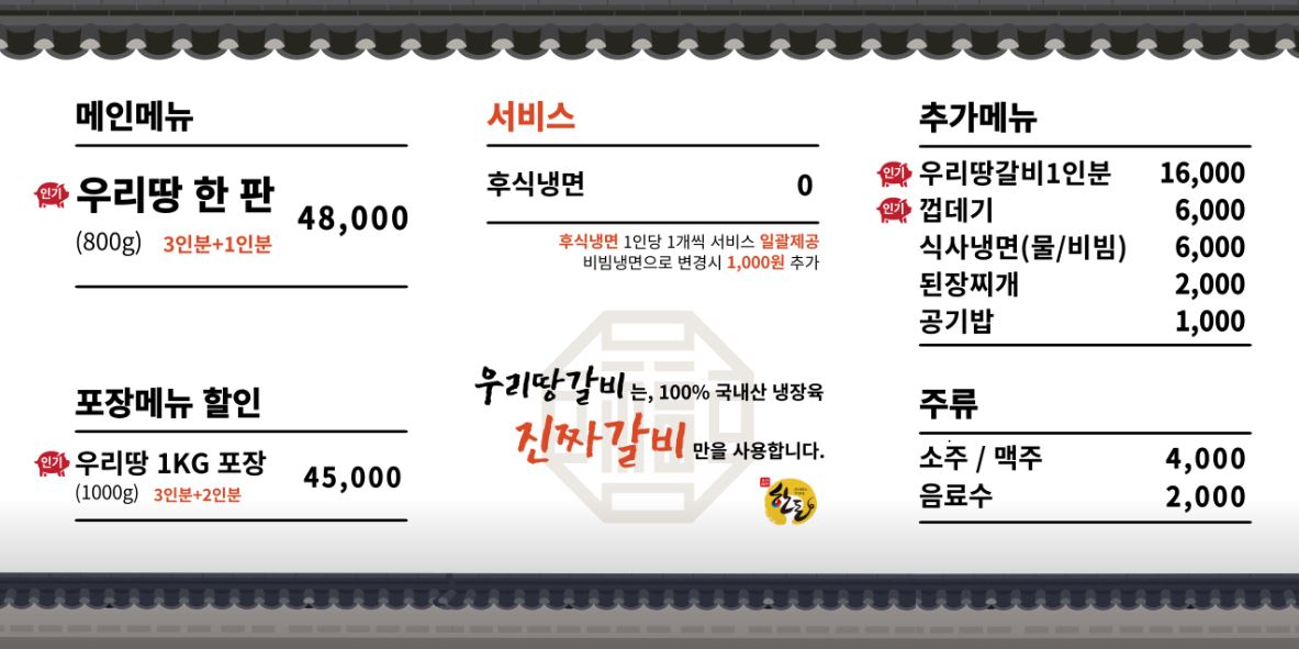 우리땅 갈비의 시그니처 메뉴는 우리땅 한 판(800g) 👉 48,000원.